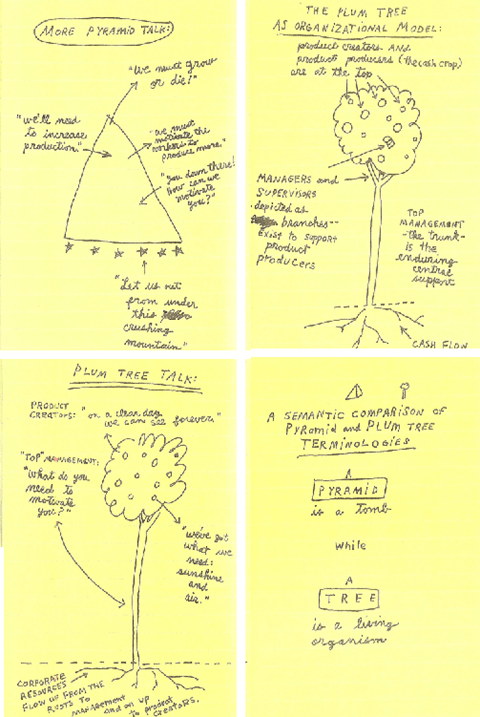 Pyramidal Org Charts vs. the Plum Tree– Perhaps the best chapter uncovers the compare-and-contrast analysis between the life-sucking pyramidal organization that roles up to a single point at the top, with Gordon’s Plum Tree description. Seeing the nurturing and growing support of a root system and tree trunk of management to enable employees in the leaves of the tree to produce fruit is an effective way of seeing what will drive innovation – if the company’s leadership has the will. The following four pages copied from the book makes this concept plain and simple.